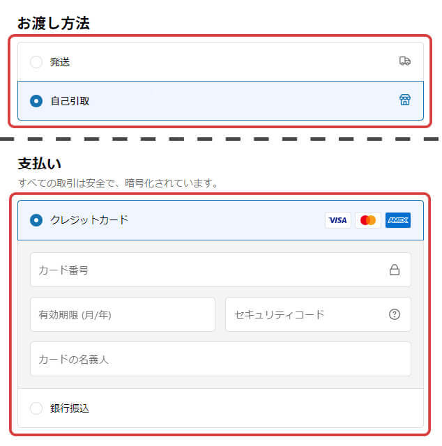 お支払い方法は「クレジットカード」または「銀行振込」から選べますが、定期購入にはクレジットカードのみ対応しています。お届け先が注文者住所と異なる場合は、別途住所の入力が必要です。
