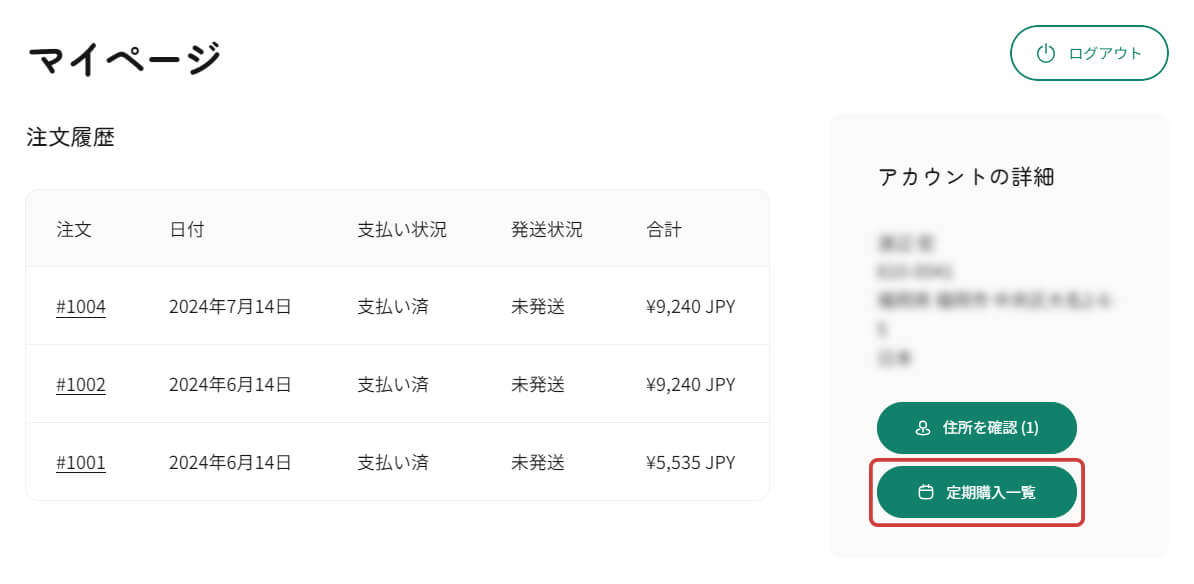 マイページ上の「定期購入一覧」をクリックすると、定期購入の注文内容をご確認いただけます。